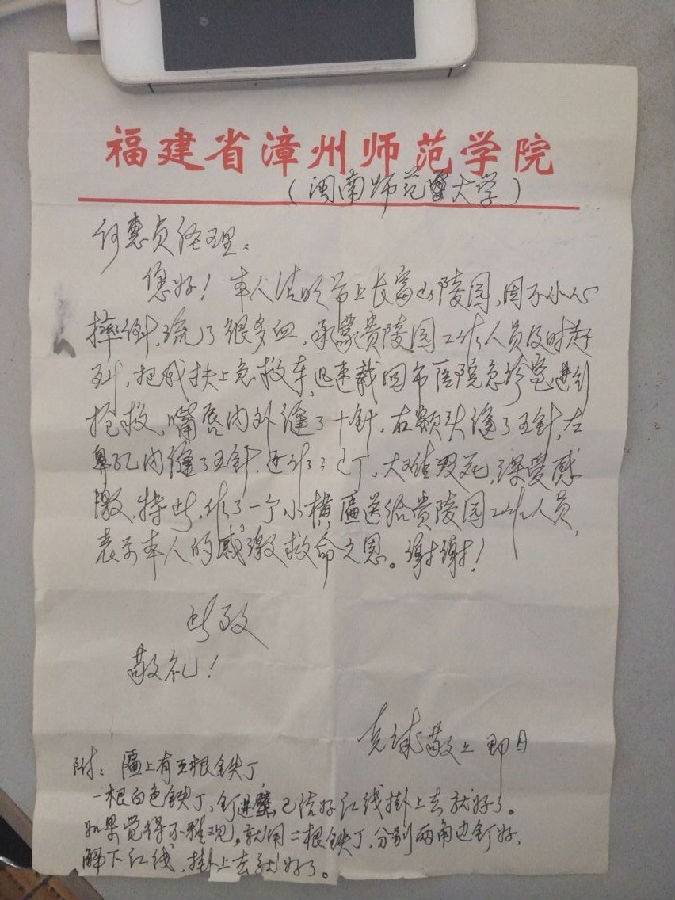 原来,一个月前,正好是清明节期间,施老独自一人乘坐公交车到长富山看墓型。在墓区观看途中不慎摔倒,头撞到了旁边的墓碑上,顿时满脸是血。园区工作人员叶龙辉第一个发现赶过去,随后,黄伟明、蔡青俊也及时赶到,三人对伤口进行了简单的止血处理后,立即开车送往医院,在送往医院的途中,也及时通知了施老的家属。到达医院后帮忙处理好挂号、入院等手续,三人才放心的回去。当天下午,工作人员也向其子女咨询了施老的伤势,伤口缝了十几针,身体其他部位并无大碍。陵园上下人员终于放下心来。